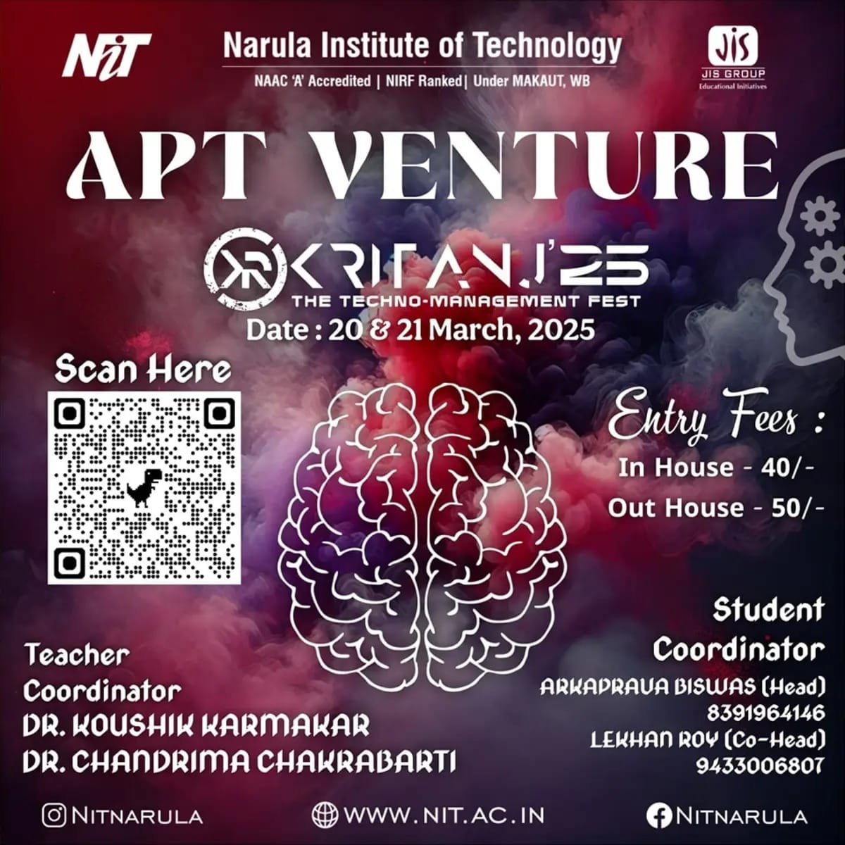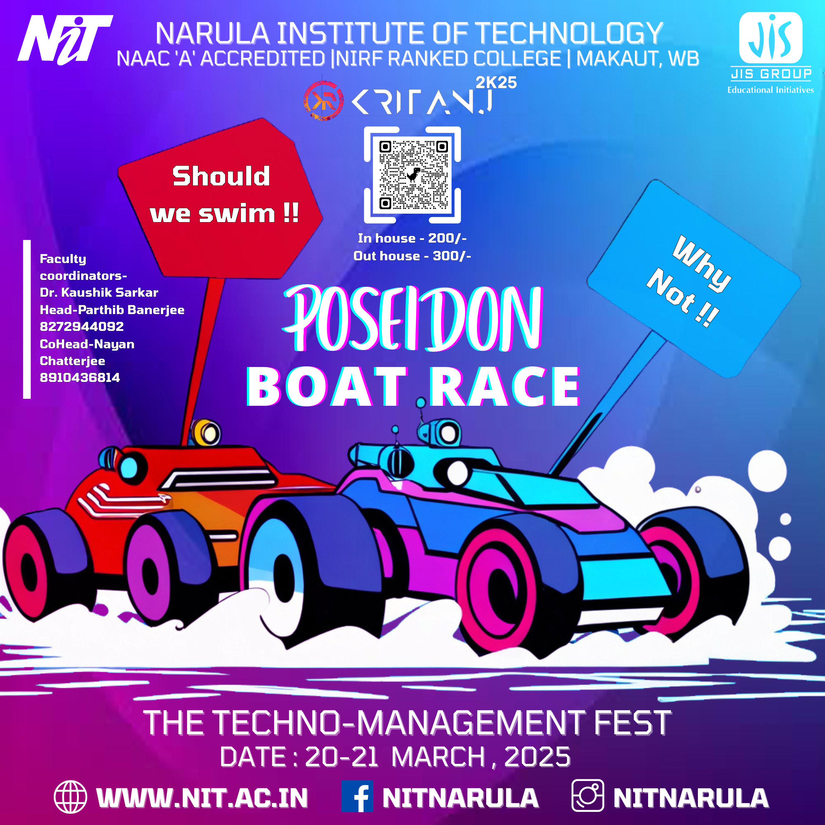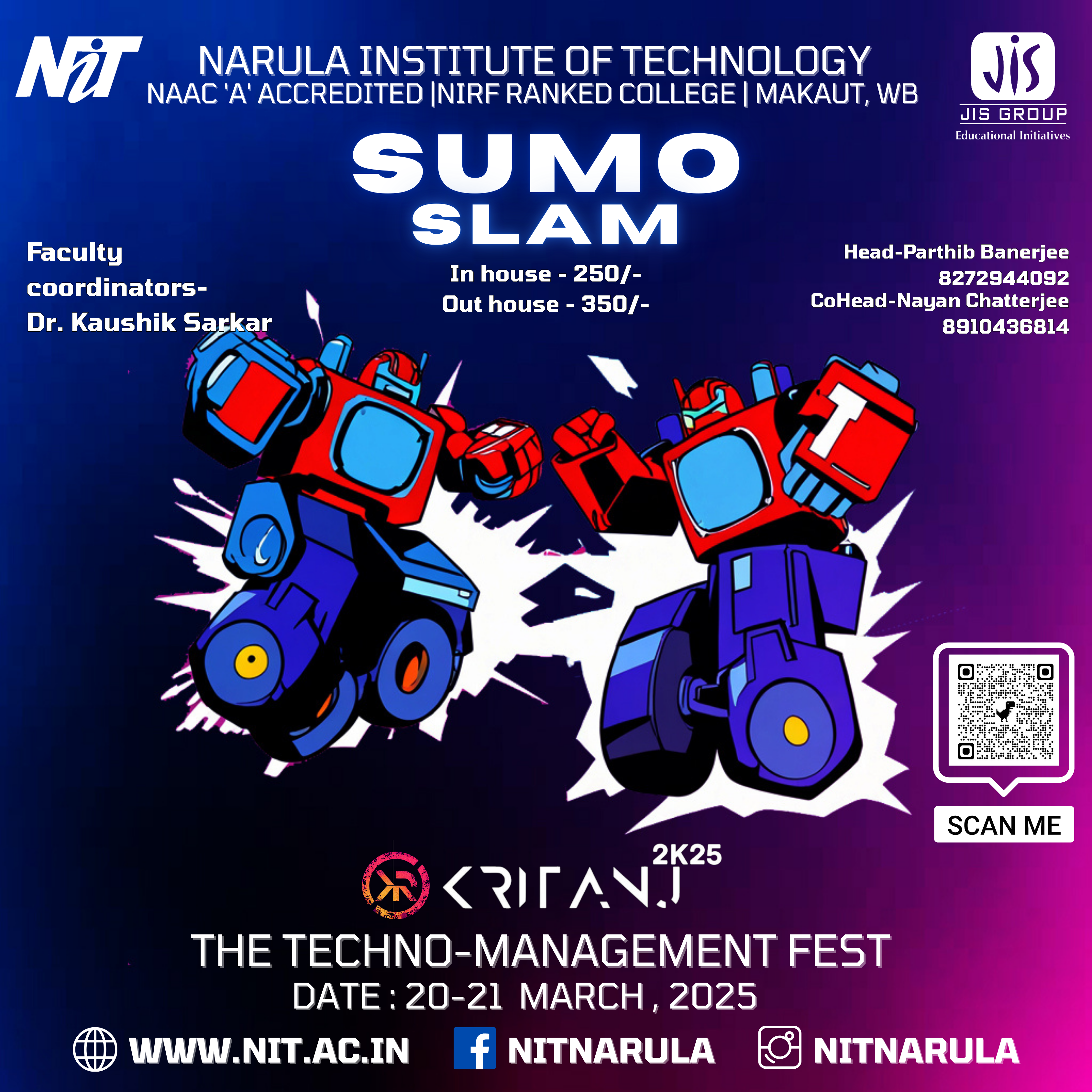 The annual tech fest of Narula Institute of Technology. Featuring hackathons, coding contests, robotics challenges, civil creations, workshops, tech exhibitions, and many more!
