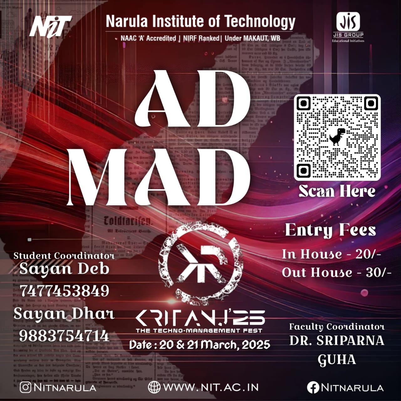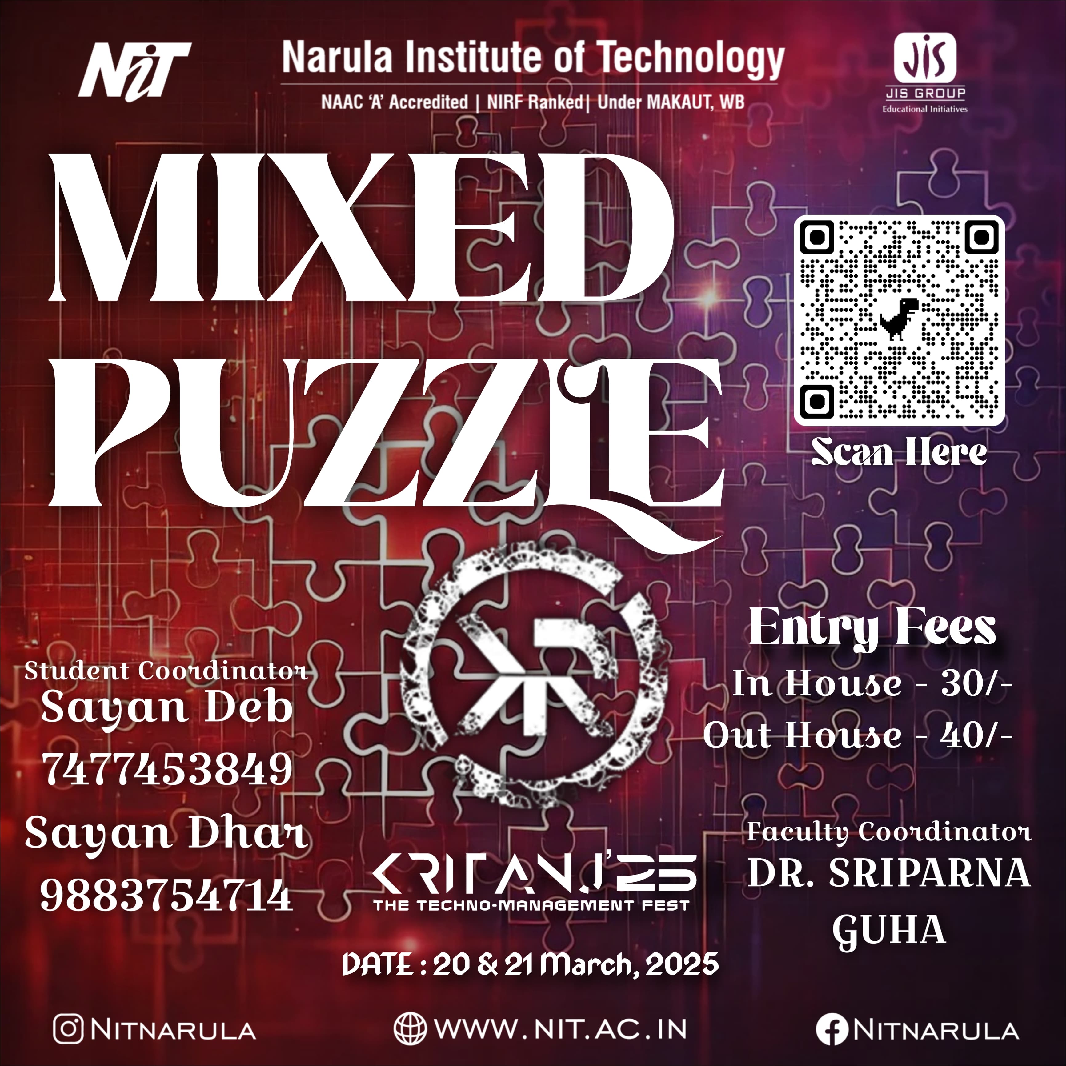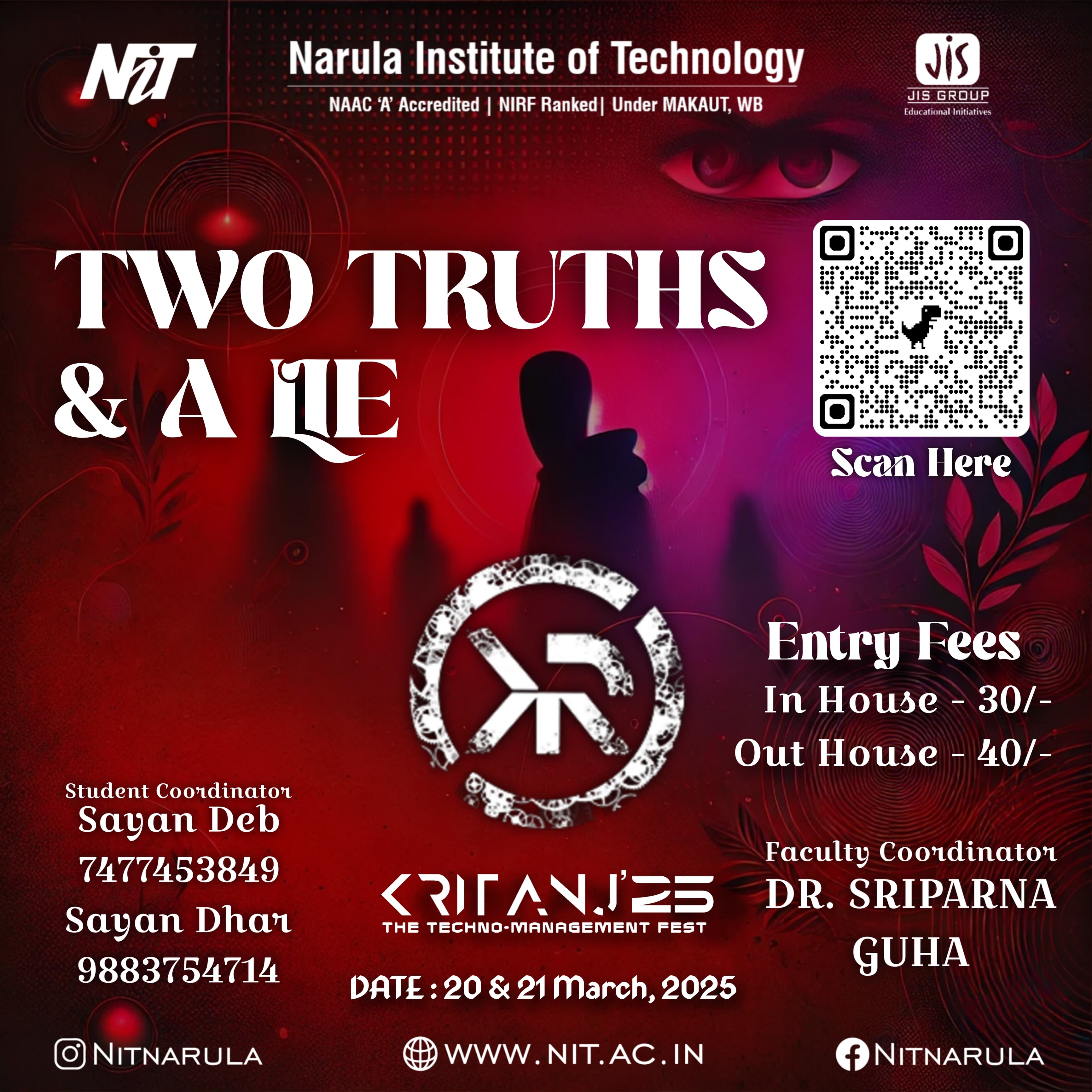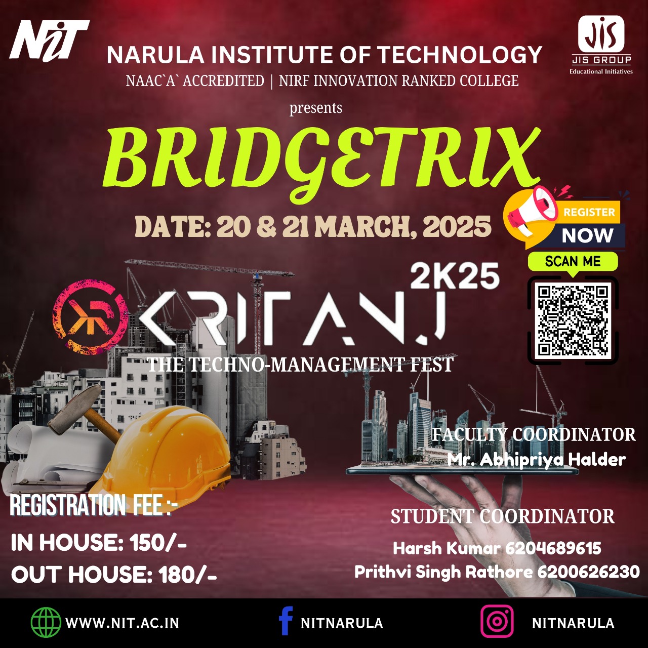 The annual tech fest of Narula Institute of Technology. Featuring hackathons, coding contests, robotics challenges, civil creations, workshops, tech exhibitions, and many more!