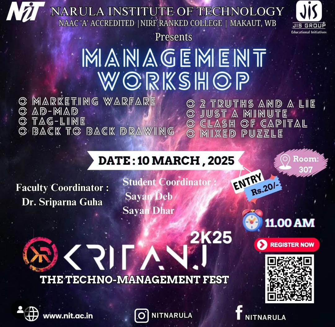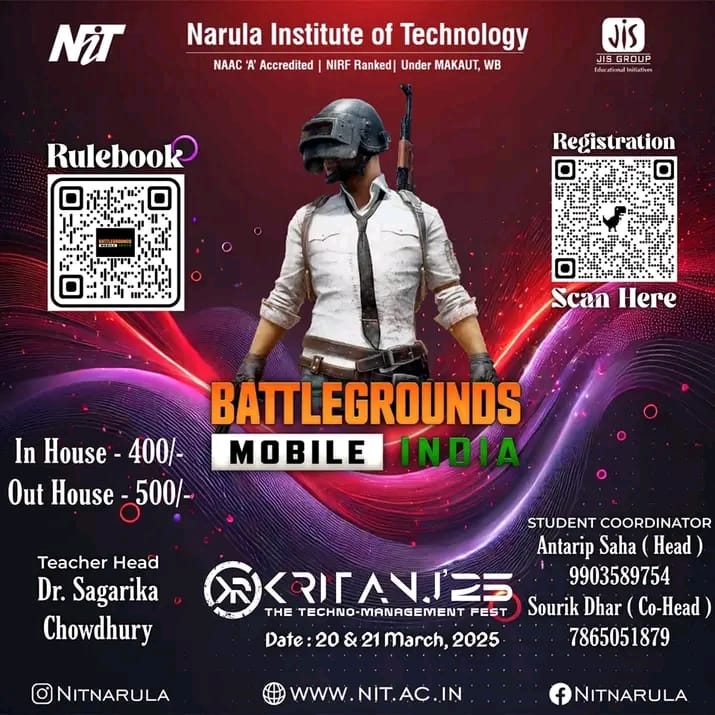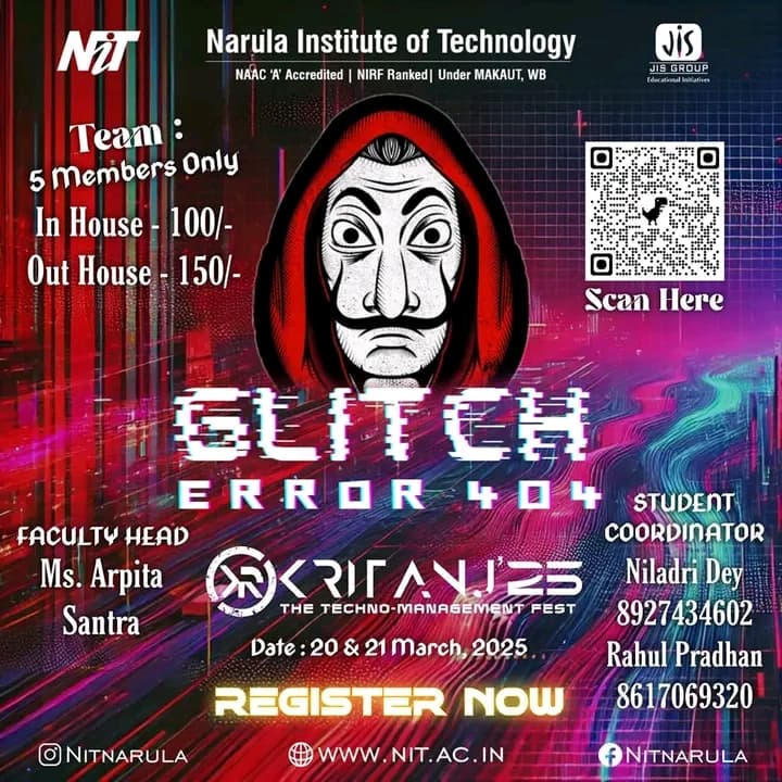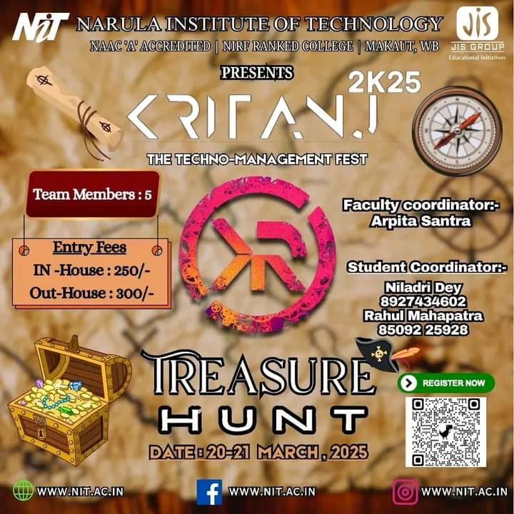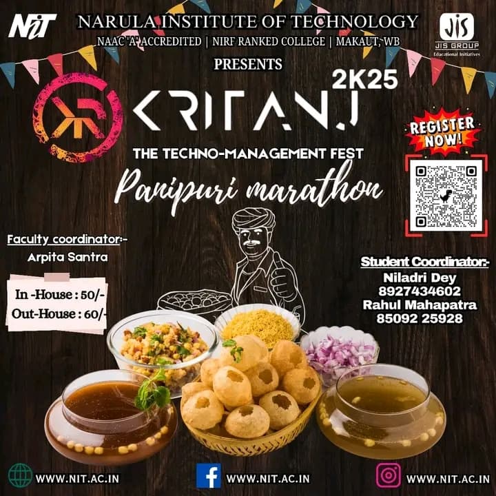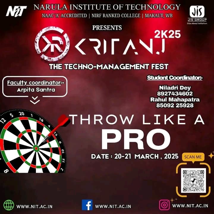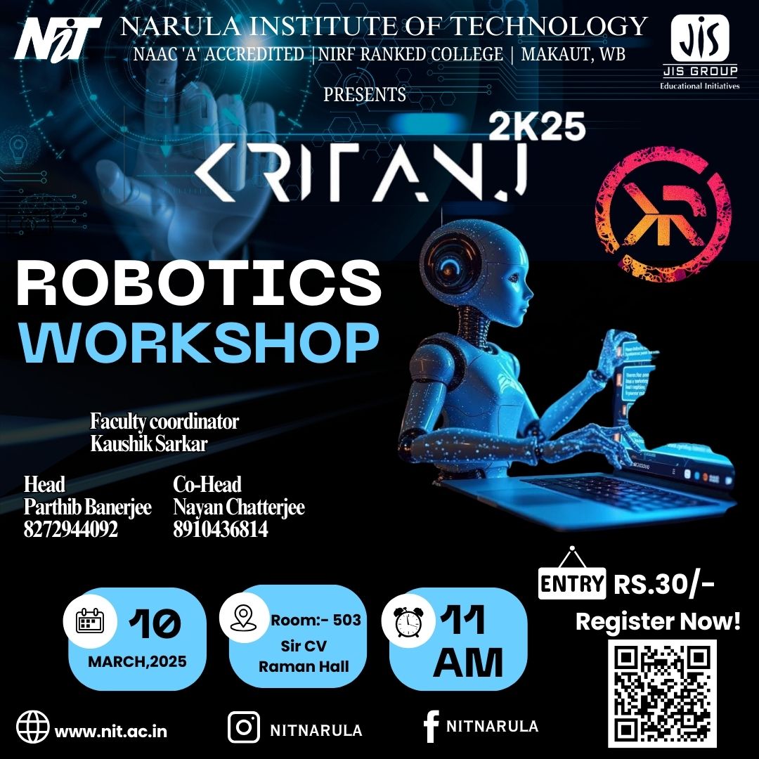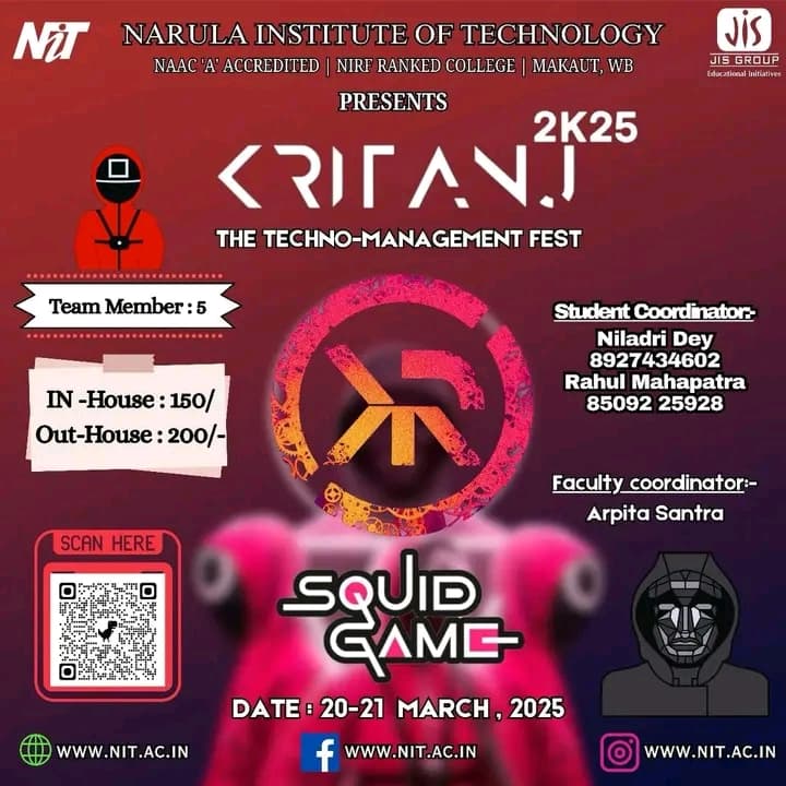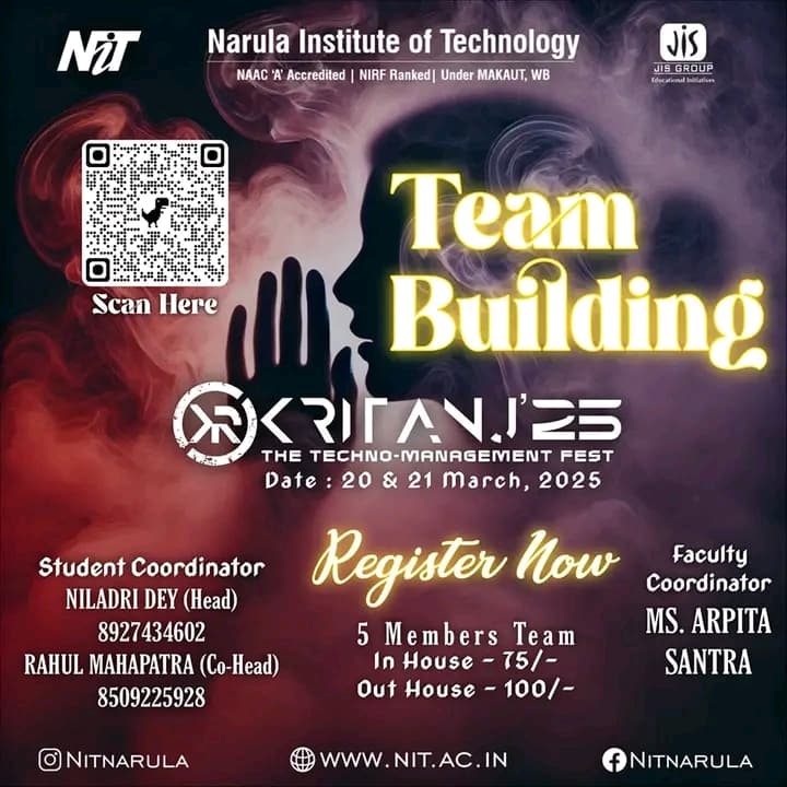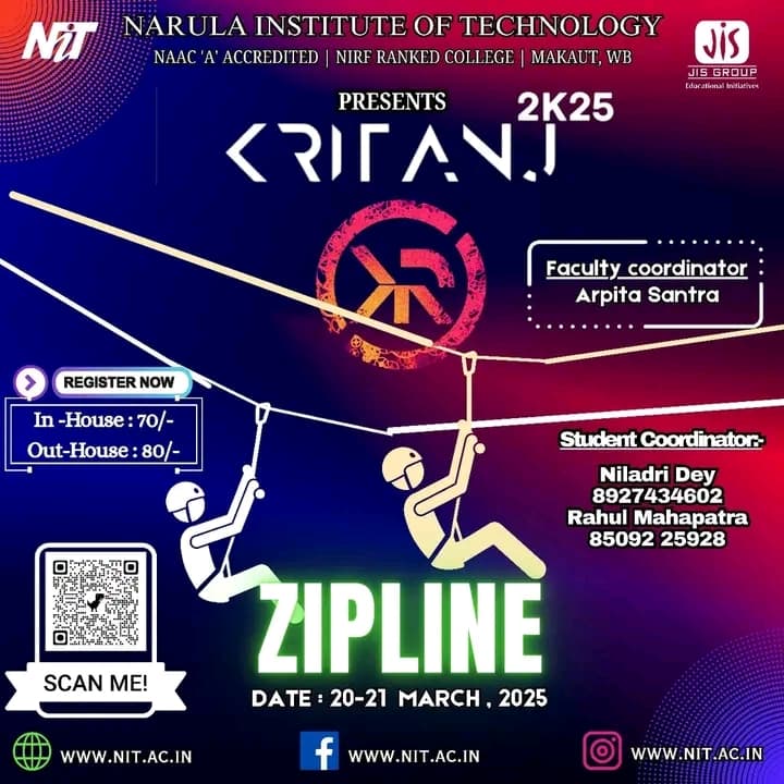 Kritanj Is The Annual Two-Day Tech Fest of Narula Institute of Technology, Bringing Together Innovation, Technology, And Creativity. Held from 20th - 21st March 2025, Kritanj serves as a platform for students to compete, collaborate, and create. The Name Kritanj is Derived From "Kriti" (Creation) And "Anj" (Offering), Symbolizing The Power Of Idea Turning Into Reality.
