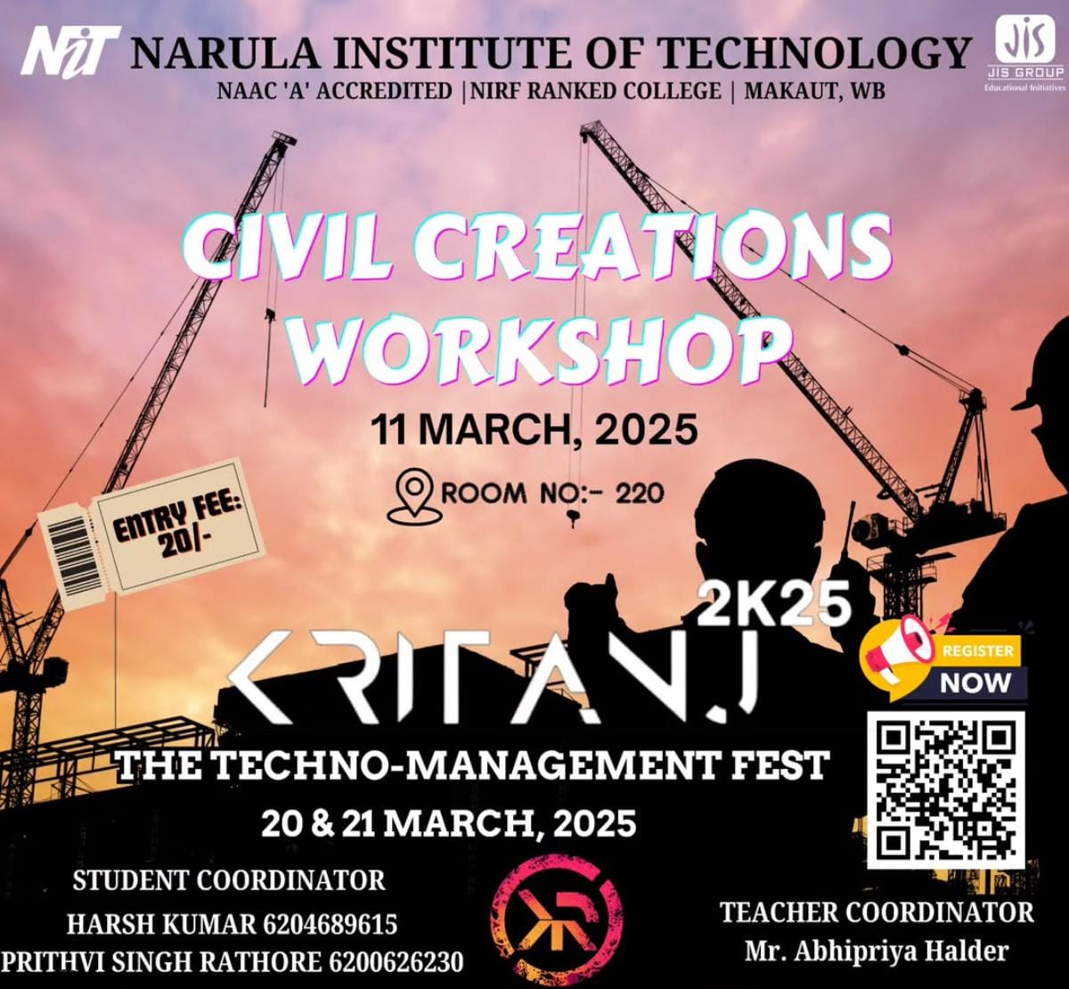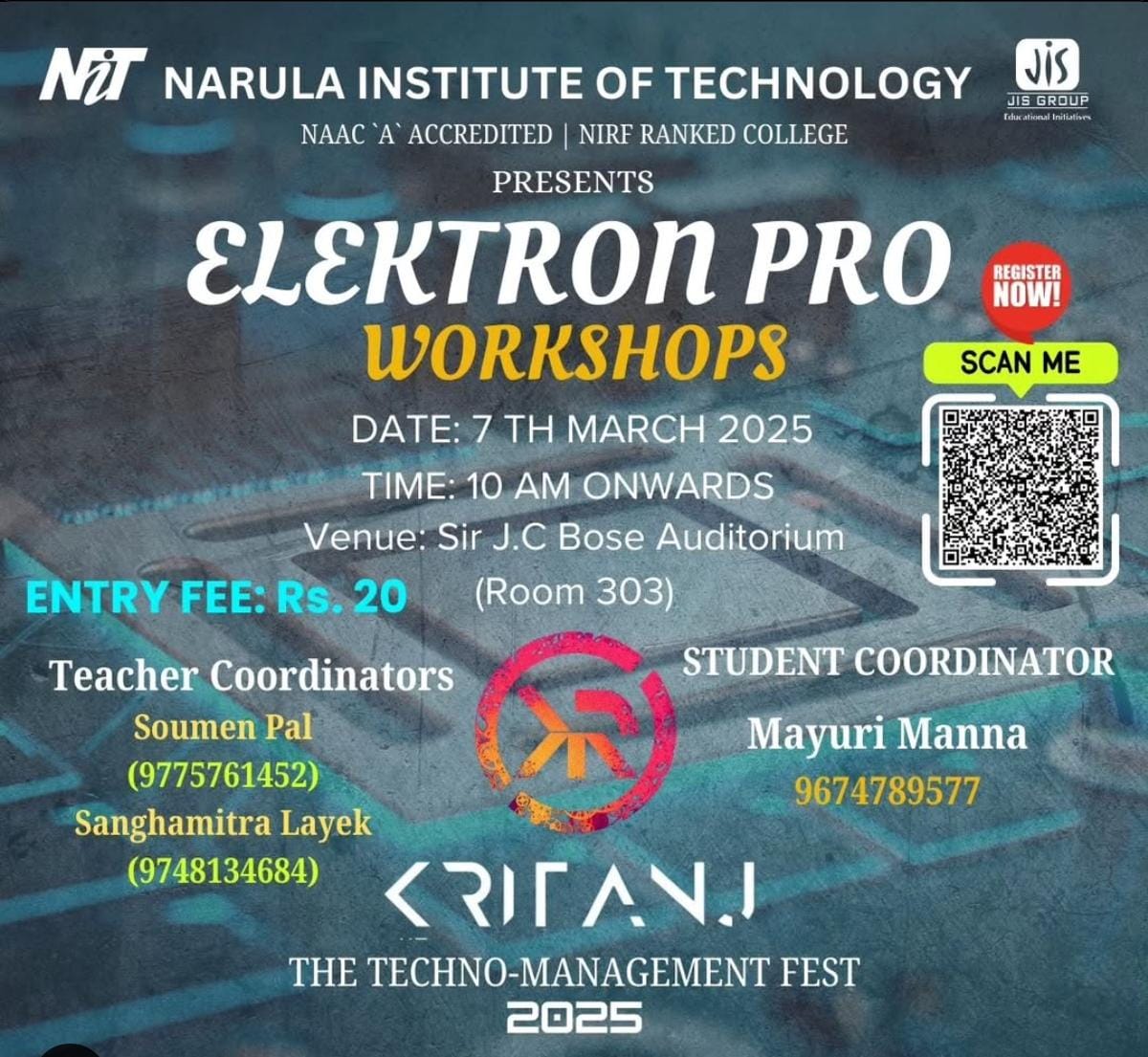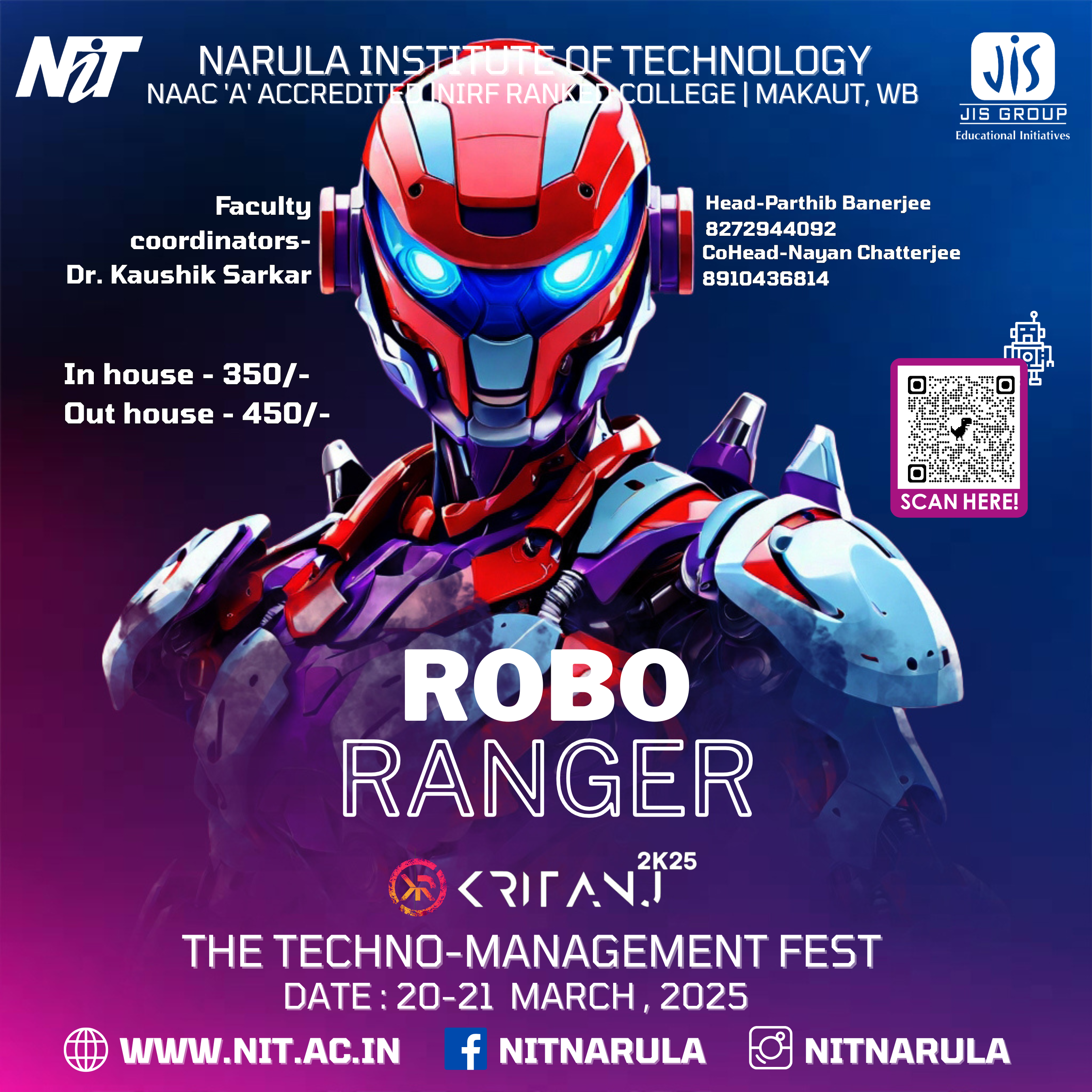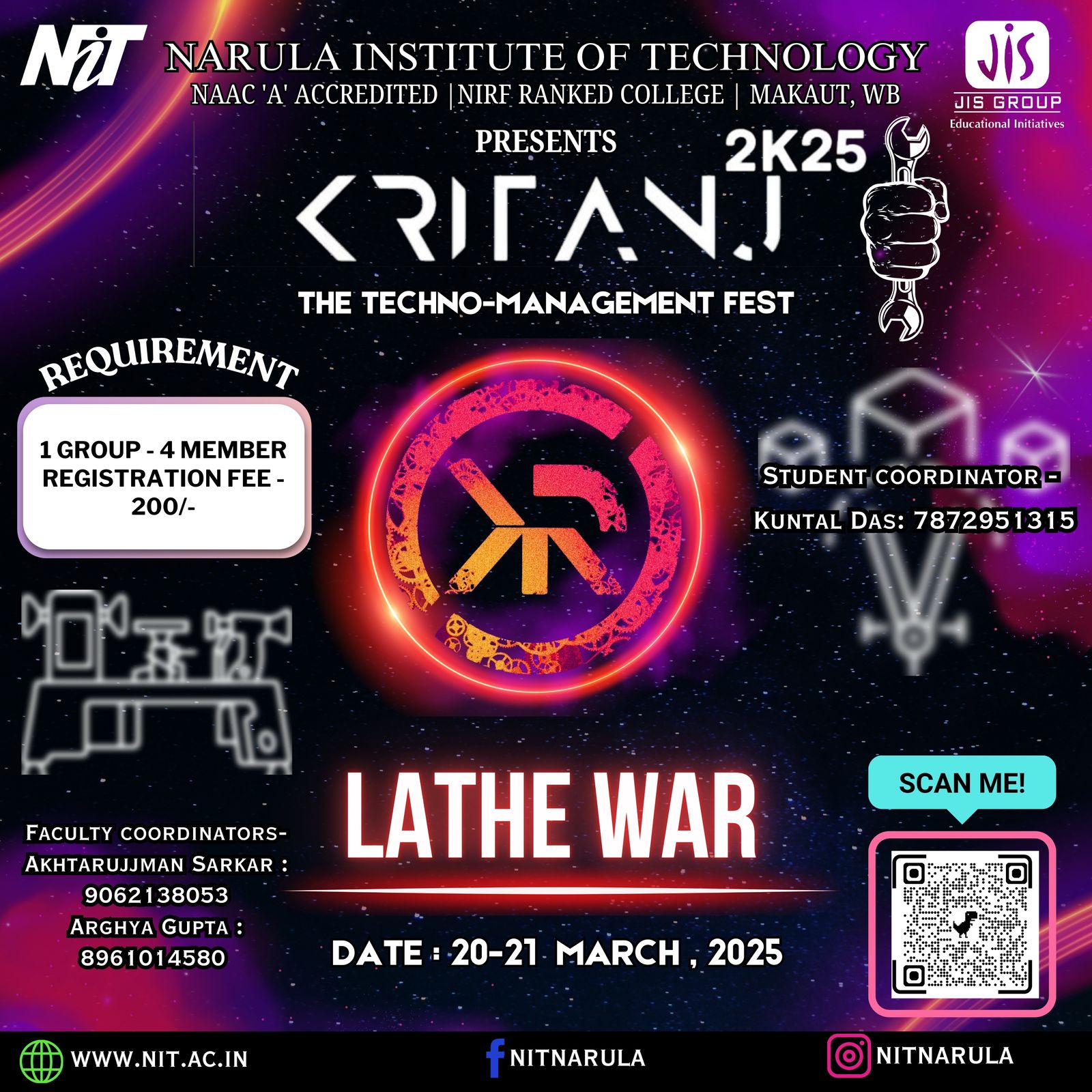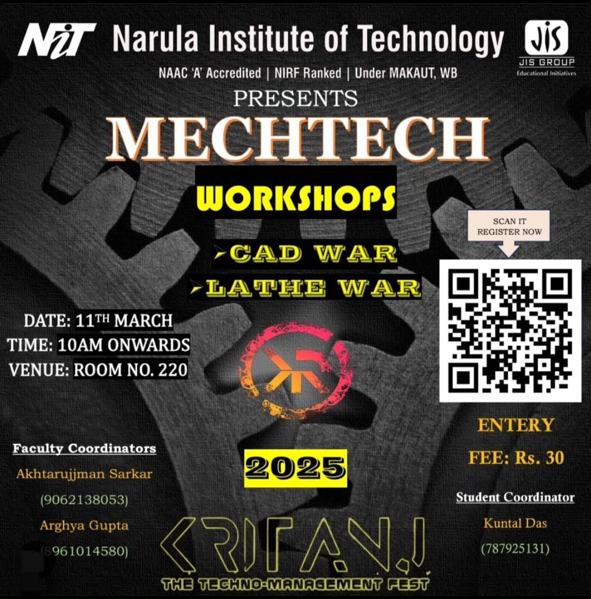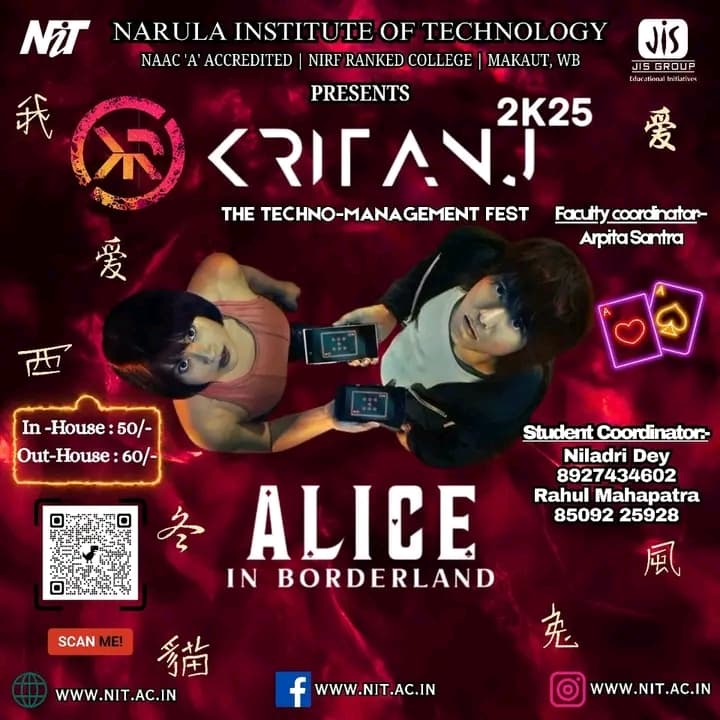 Kritanj Is The Annual Two-Day Tech Fest of Narula Institute of Technology, Bringing Together Innovation, Technology, And Creativity. Held from 20th - 21st March 2025, Kritanj serves as a platform for students to compete, collaborate, and create. The Name Kritanj is Derived From "Kriti" (Creation) And "Anj" (Offering), Symbolizing The Power Of Idea Turning Into Reality.