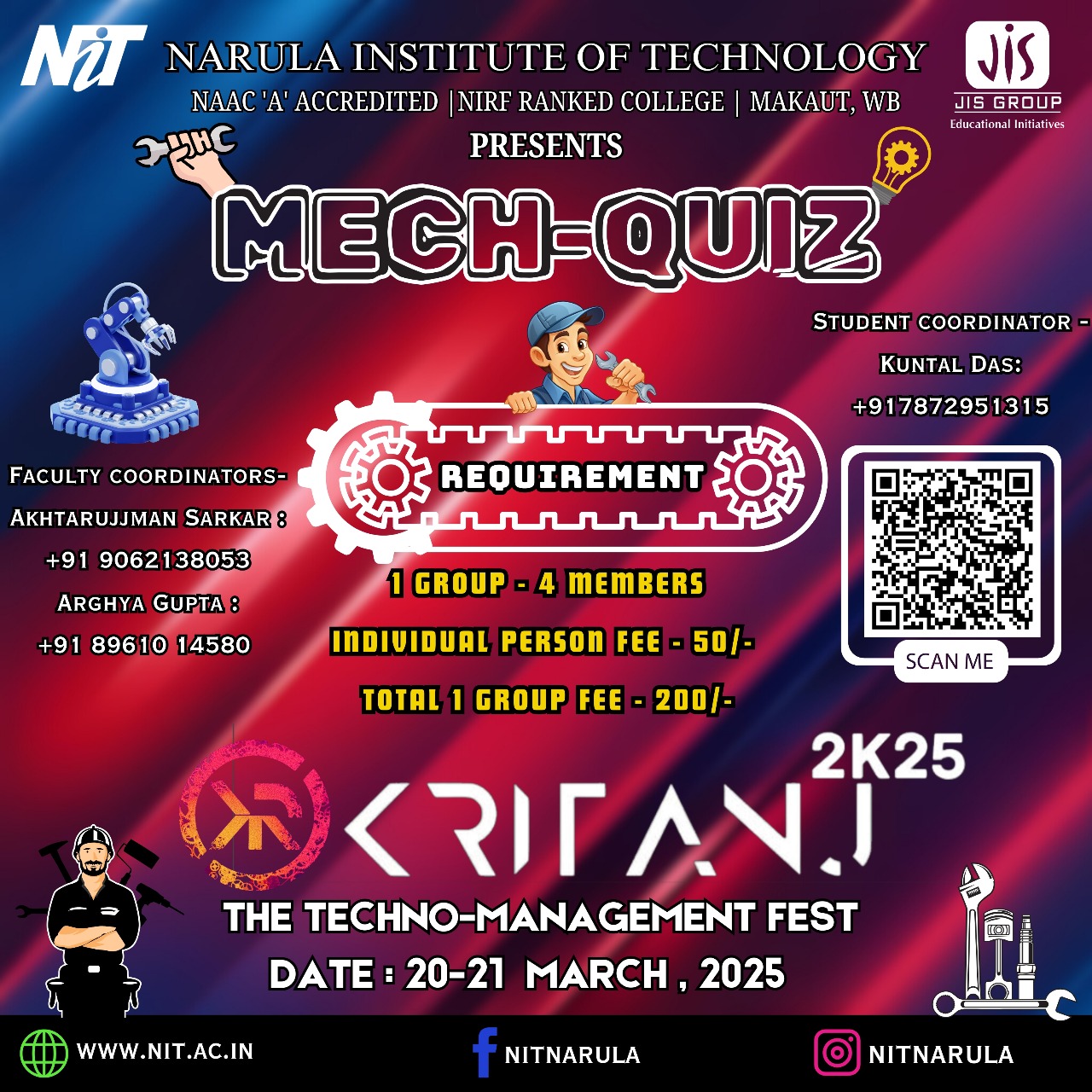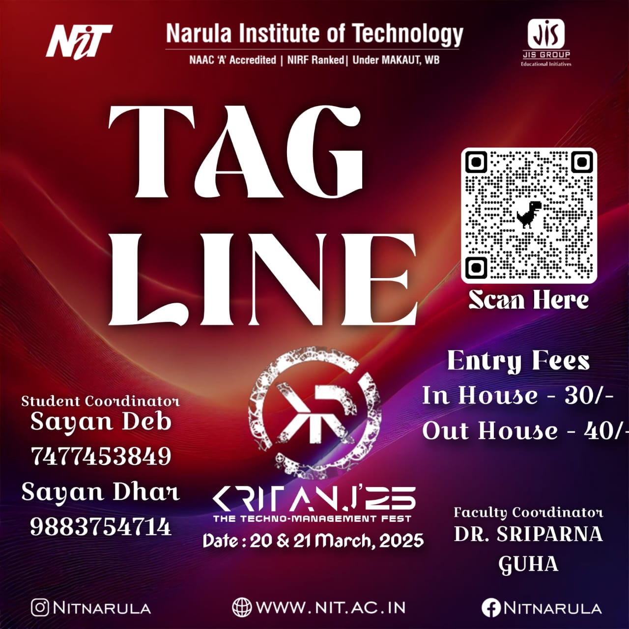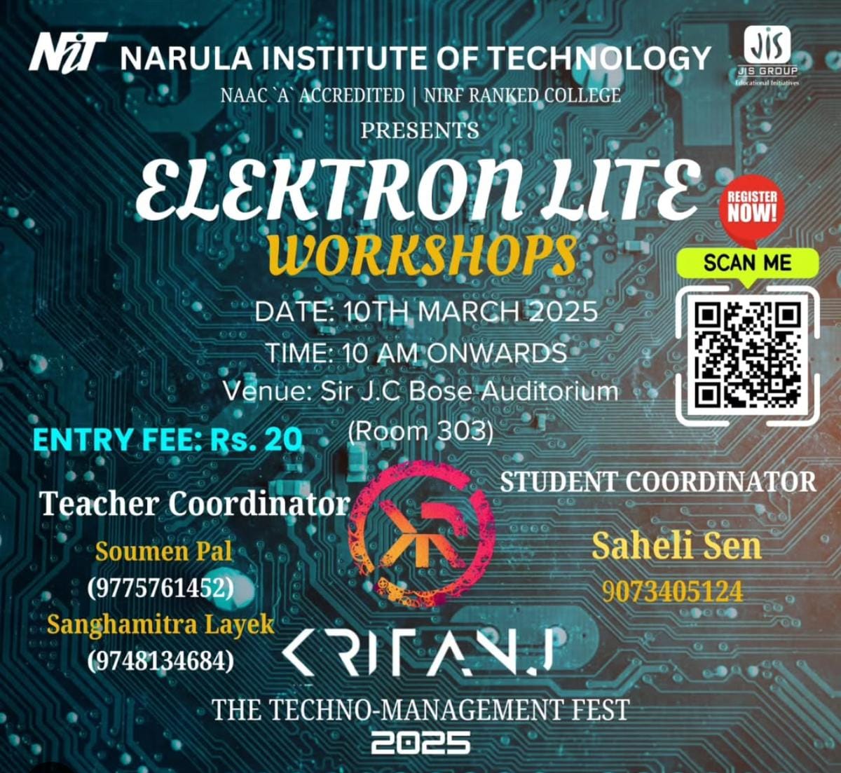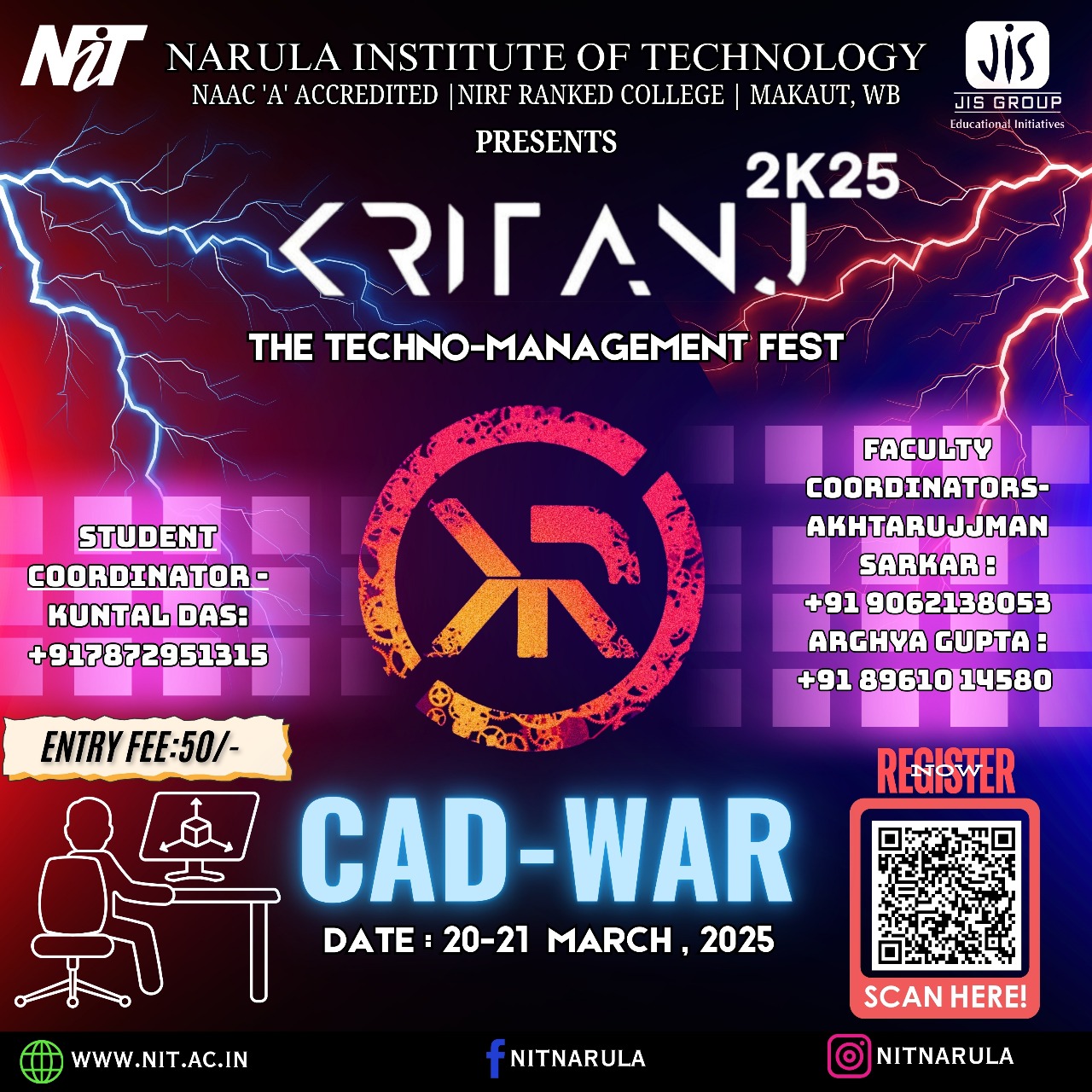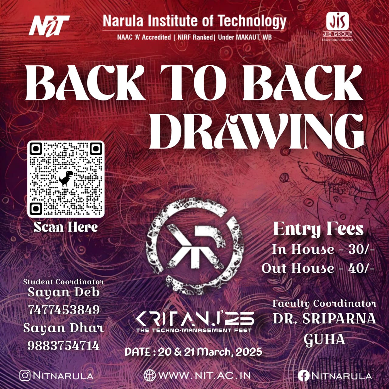 Kritanj Is The Annual Two-Day Tech Fest of Narula Institute of Technology, Bringing Together Innovation, Technology, And Creativity. Held from 20th - 21st March 2025, Kritanj serves as a platform for students to compete, collaborate, and create. The Name Kritanj is Derived From "Kriti" (Creation) And "Anj" (Offering), Symbolizing The Power Of Idea Turning Into Reality.